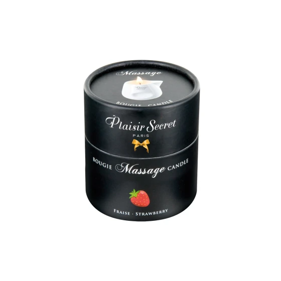 Huile tiède à la fraise pour caresses sensuelles et peau satinée. Pot bec verseur, 80 ml, fabriquée en France.