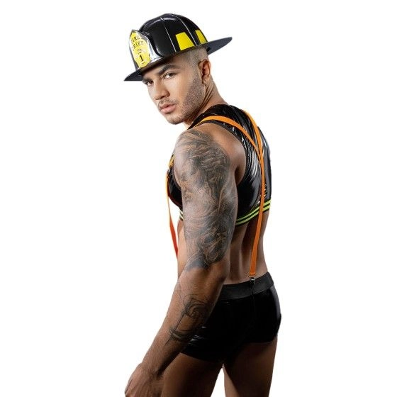 Allumez le désir avec ce costume pompier 4 pièces : wetlook sensuel, détails fluo et confort stretch pour des jeux brûlants.
