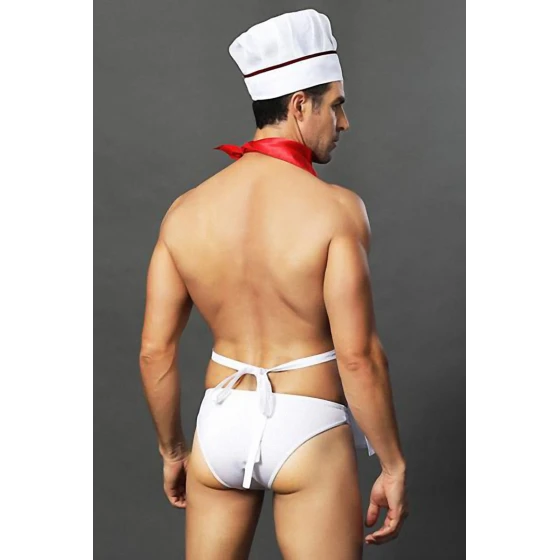Servez la passion: tablier, slip, toque et tour de cou. Matière douce et stretch pour un jeu de rôle irrésistible.