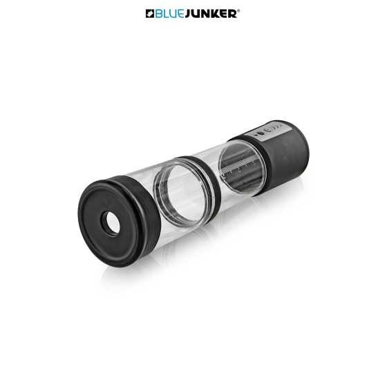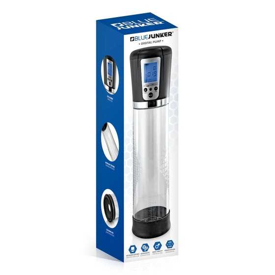 Pompe à pénis vibrante Blue Junker: volume visible, érections plus fermes, confort pro, tube gradué 20x6 cm, vibrations réglables.