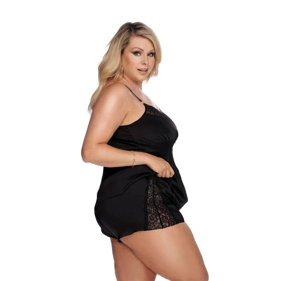 Satin noir et dentelle, confort XL à 6XL. Réglable et doux : sublimez vos courbes avec l’ensemble caraco & short Laura par...