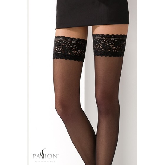 Bas autofixants couture noirs Passion: maintien sûr, dentelle florale et voile 17D pour des jambes sublimées et un confort soyeux.