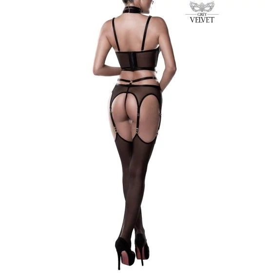 Sculpte vos courbes, soutient la poitrine et booste l’intensité. Ensemble 4 pièces Grey Velvet, voile sensuel & harnais chic.
