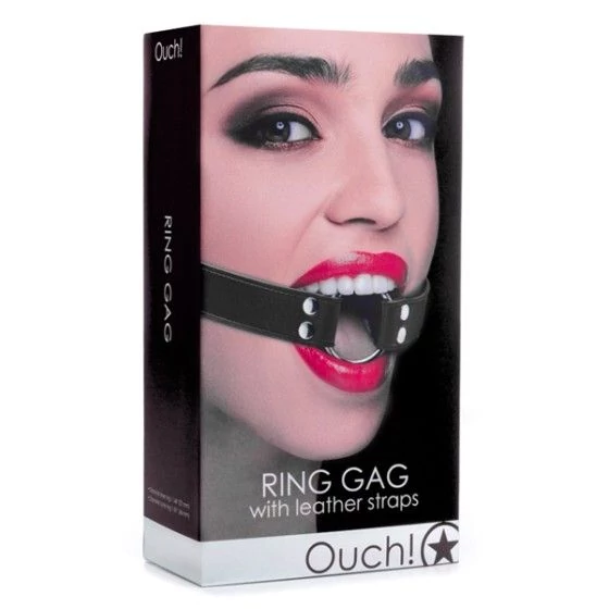 Bâillon ring gag Ouch! en cuir: confort, maintien et réglages précis. Anneau métal lisse pour des jeux BDSM intenses et maîtrisés.