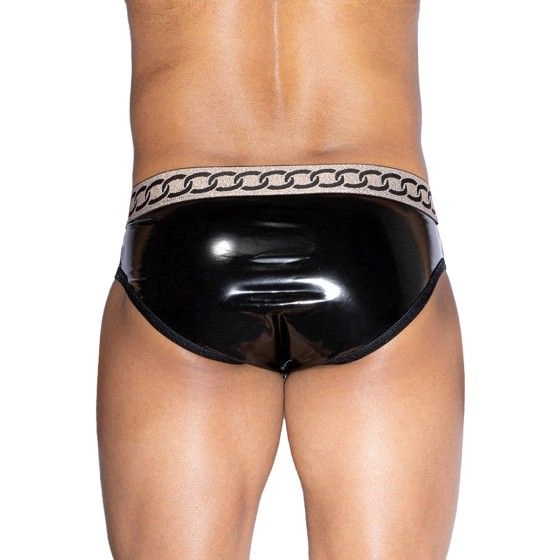 La résille fantaisie dévoile juste ce qu’il faut. Transparence maîtrisée. Attitude assumée. La large bande en faux cuir barre le torse. Effet sculptant. Présence virile immédiate.