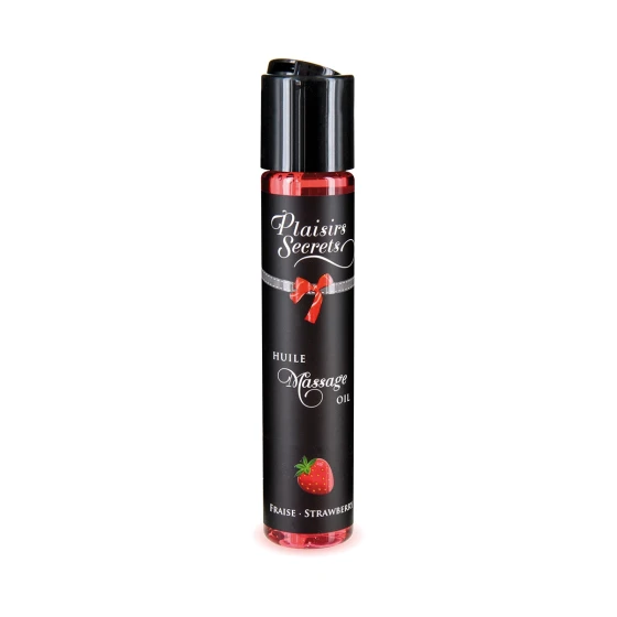 Huile de massage comestible à la fraise: texture soyeuse, effet relaxant et aphrodisiaque. Fabriquée en France, format 59 ml.
