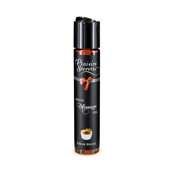 Huile de massage comestible Crème Brulée : texture soyeuse, relaxation sensuelle et baisers gourmands. Fabriquée en France.