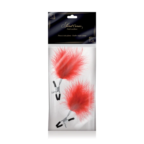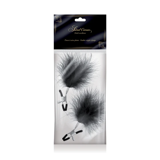 Pinces réglables avec plume noire: douceur et intensité, confort et style pour des jeux sensuels signés Sweet Caress.