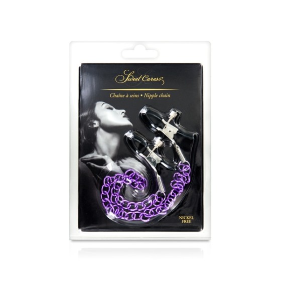 Pinces réglables et chaîne violette pour titiller les tétons. Confort, intensité et sécurité sans nickel par Sweet Caress.